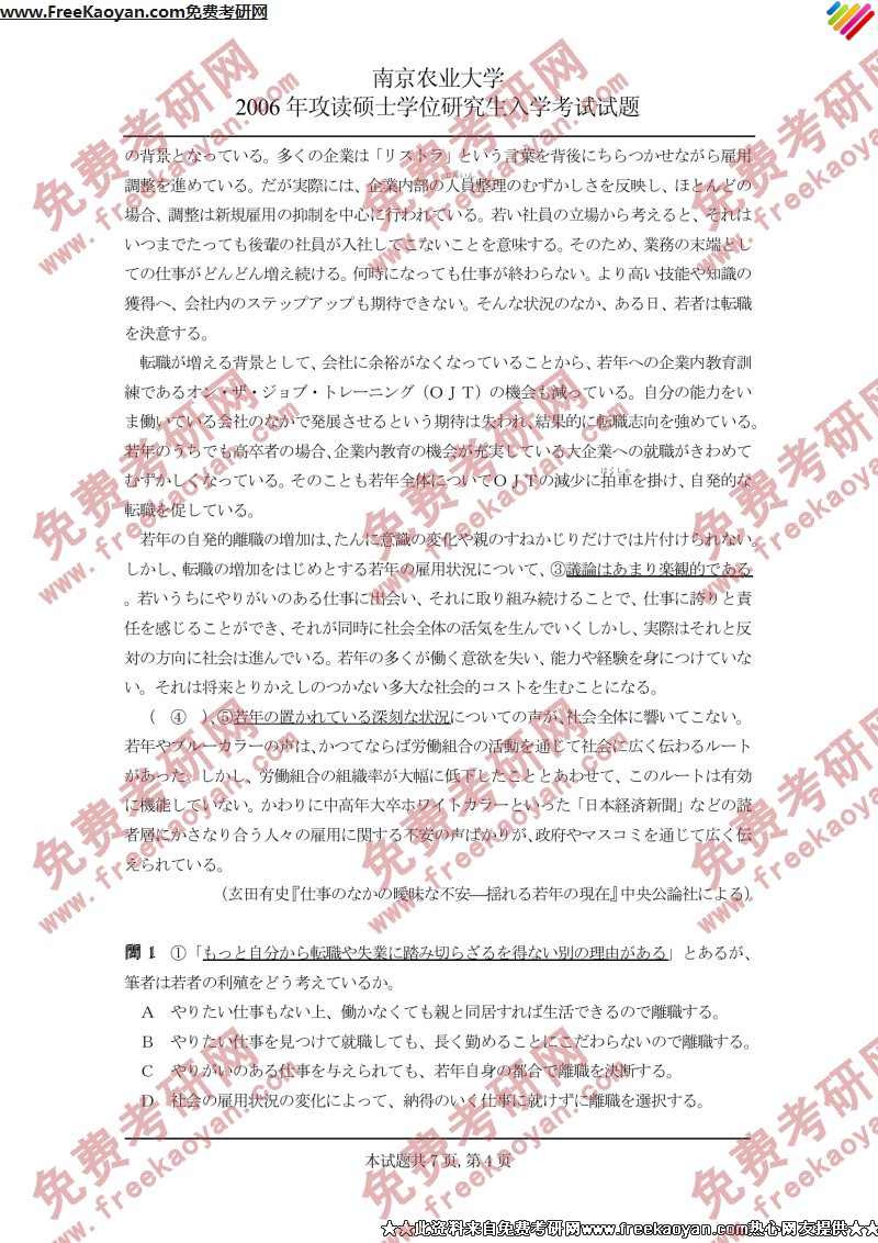 南京农业大学2006年考研真题-日语读解与写作(4)