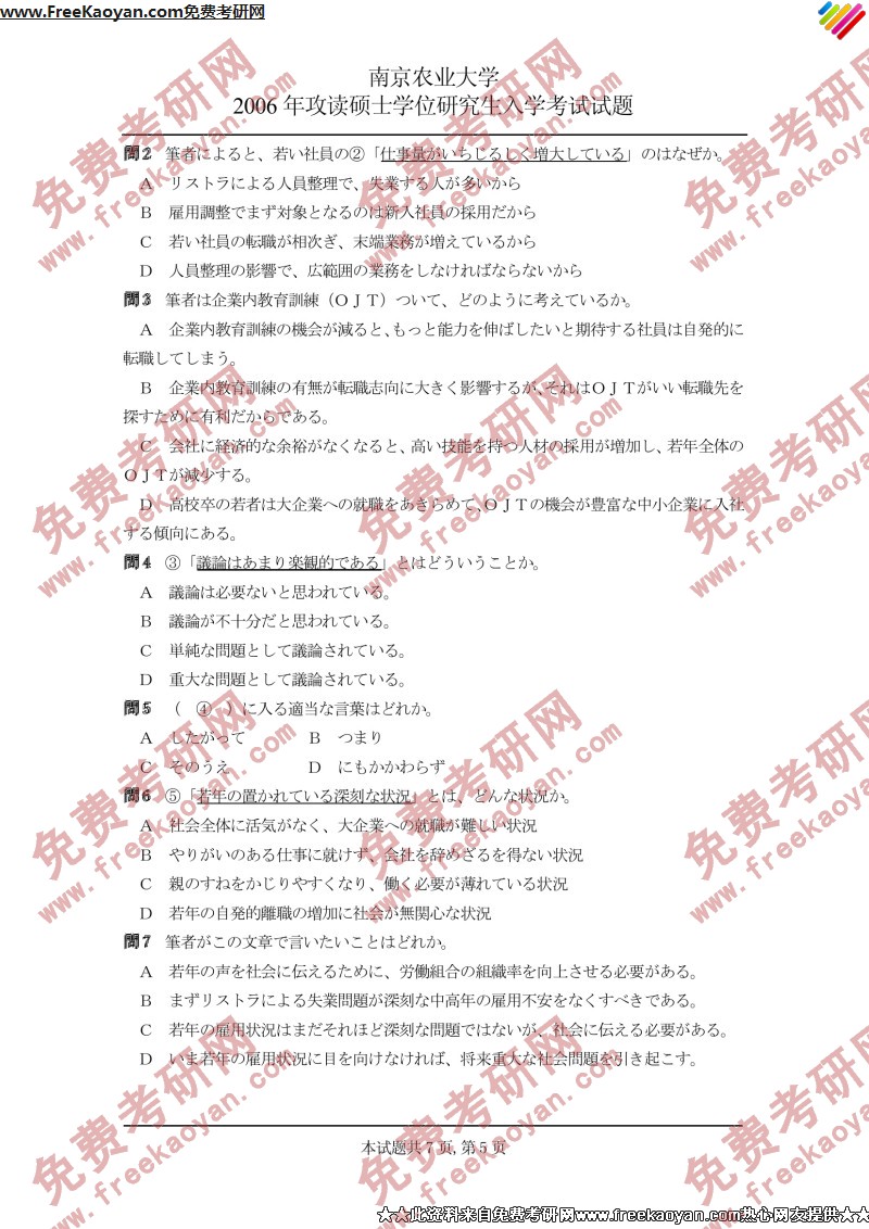 南京农业大学2006年考研真题-日语读解与写作(5)
