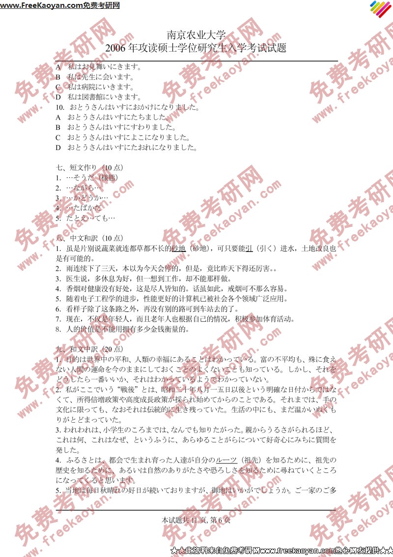专业课考研经验 本站小编 FreeKaoyan 2018-01-23南京农业大学2006年考研真题-日语读解与写作