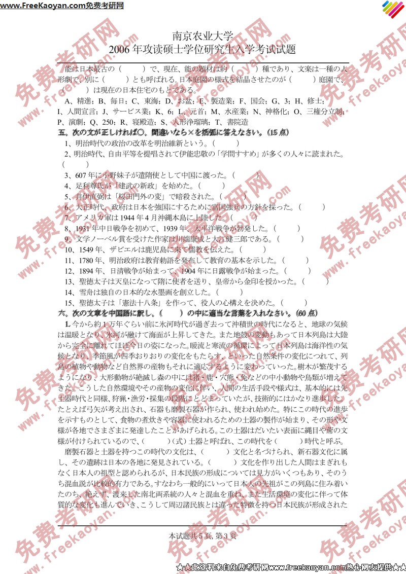 专业课考研经验 本站小编 FreeKaoyan 2018-01-23南京农业大学2006年考研真题-日语读解与写作