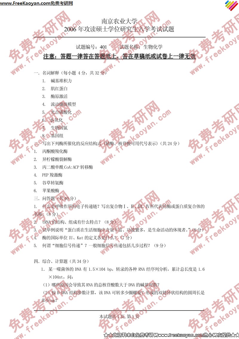 专业课考研经验 本站小编 FreeKaoyan 2018-01-23南京农业大学2006年考研真题-化学