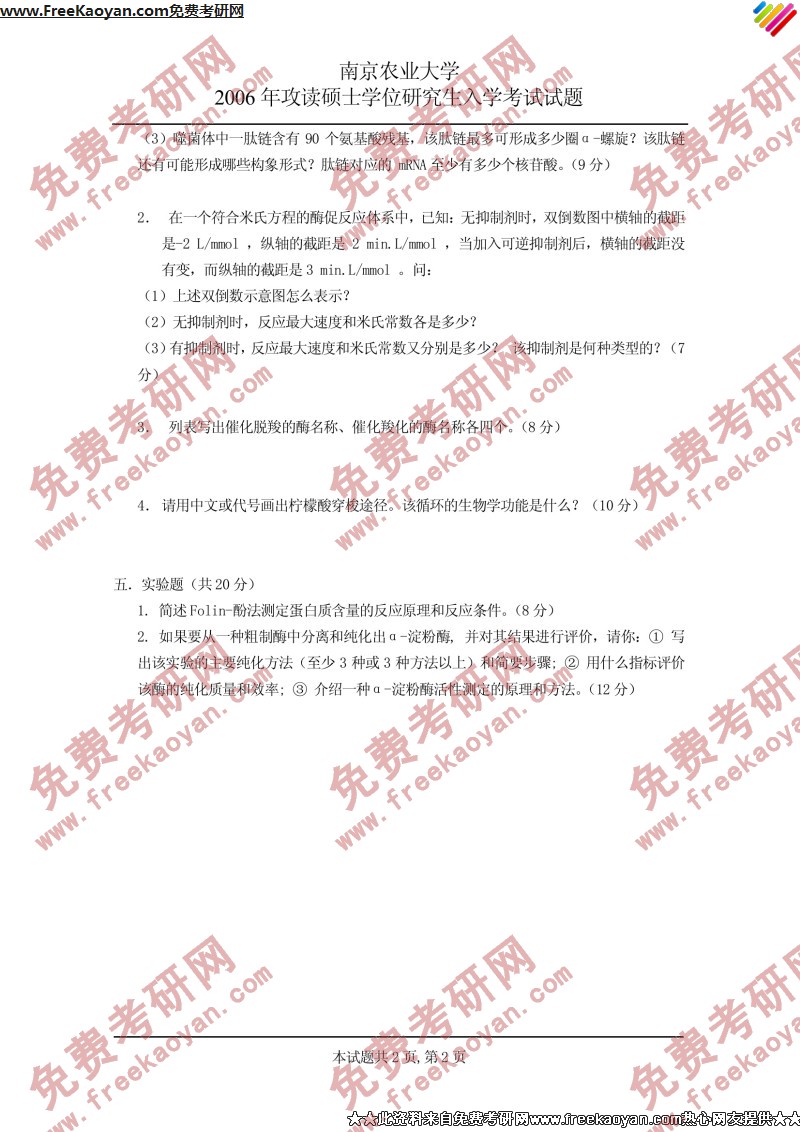 专业课考研经验 本站小编 FreeKaoyan 2018-01-23南京农业大学2006年考研真题-化学