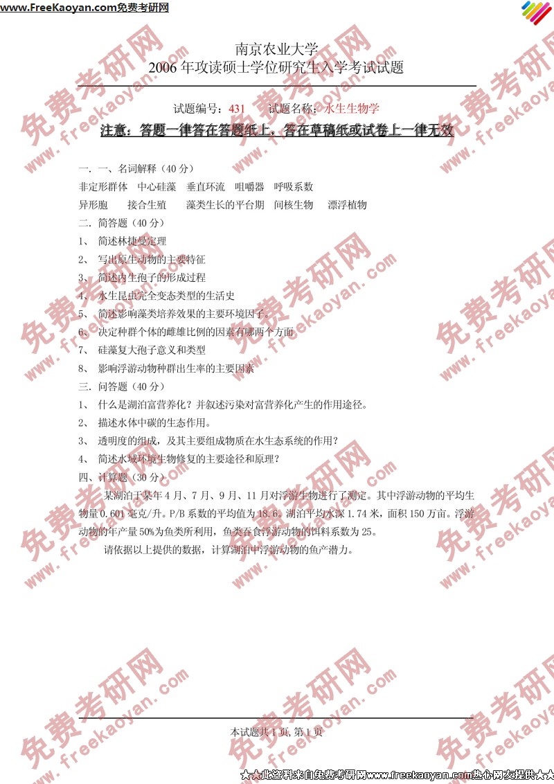 专业课考研经验 本站小编 FreeKaoyan 2018-01-23南京农业大学2006年考研真题-普通生态学