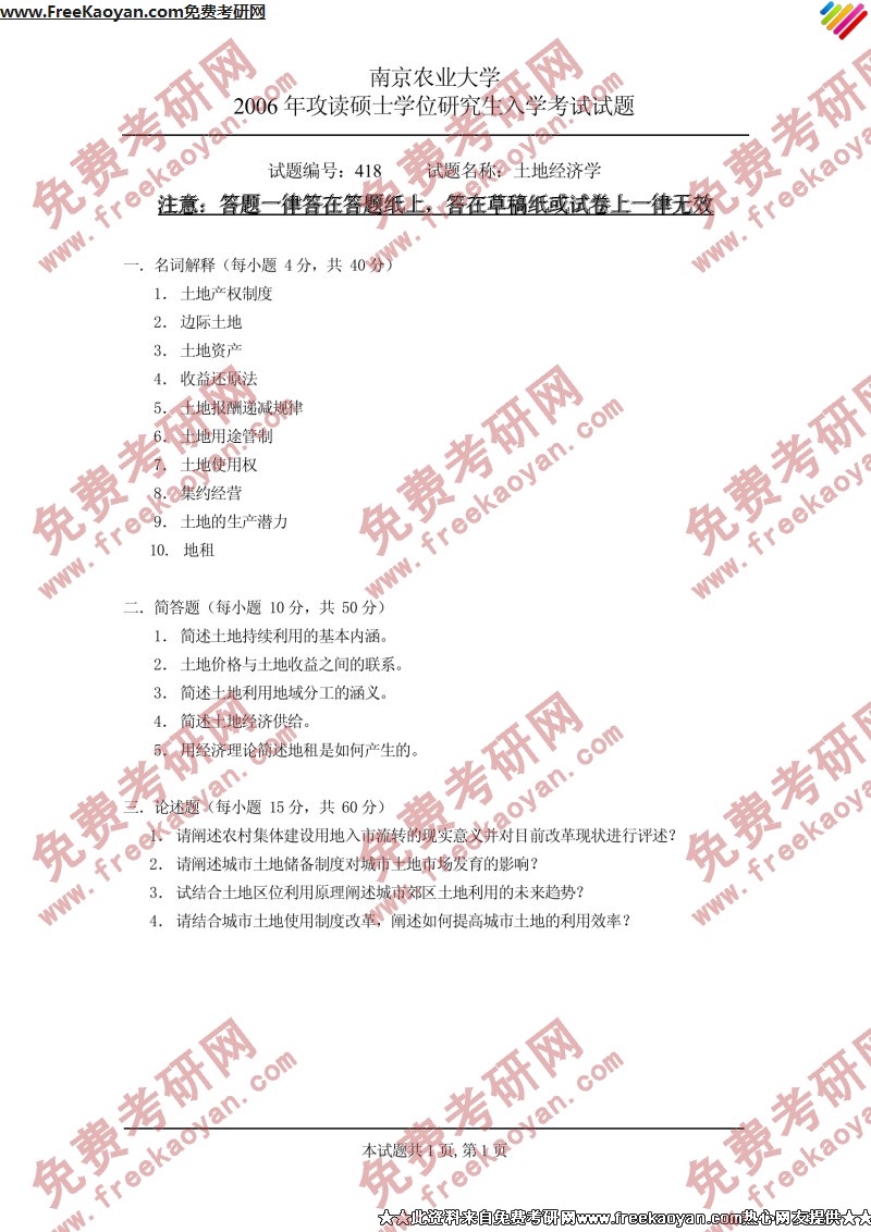 专业课考研经验 本站小编 FreeKaoyan 2018-01-23南京农业大学2006年考研真题-基础英语