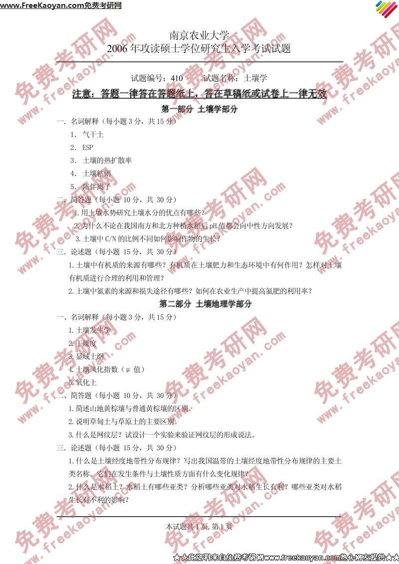 专业课考研经验 本站小编 FreeKaoyan 2018-01-23南京农业大学2006年考研真题-环境科学导论