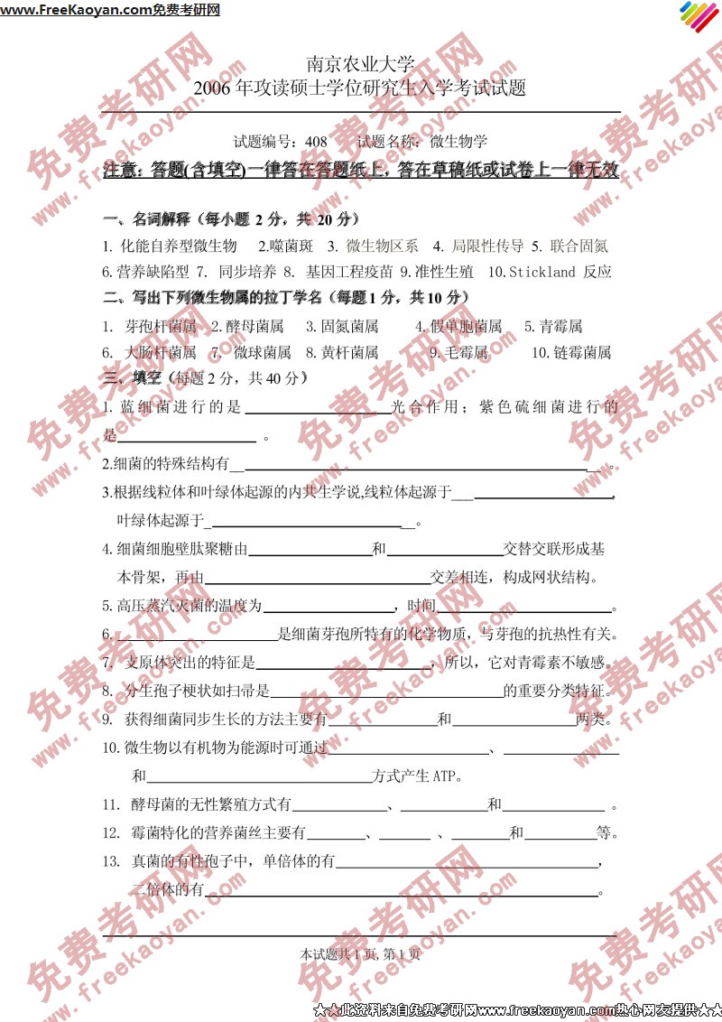 专业课考研经验 本站小编 FreeKaoyan 2018-01-23南京农业大学2006年考研真题-生物化学