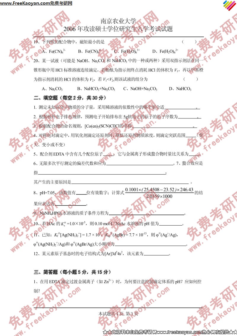 南京农业大学2006年考研真题-无机及分析化学(3)