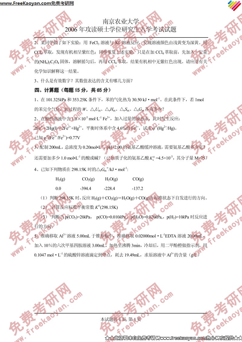 南京农业大学2006年考研真题-无机及分析化学(4)