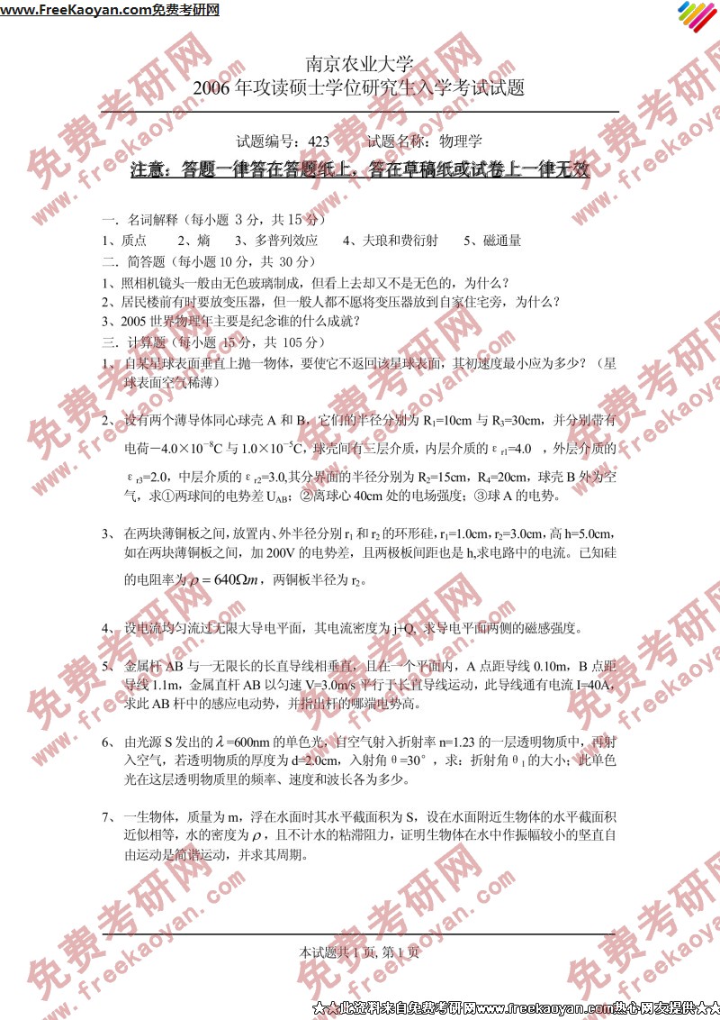 南京农业大学2006年考研真题-物理