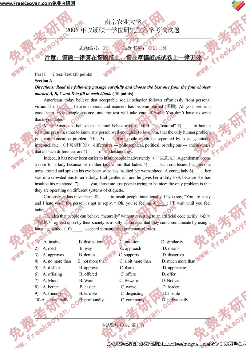 专业课考研经验 本站小编 FreeKaoyan 2018-01-23南京农业大学2006年考研真题-无机及分析化学