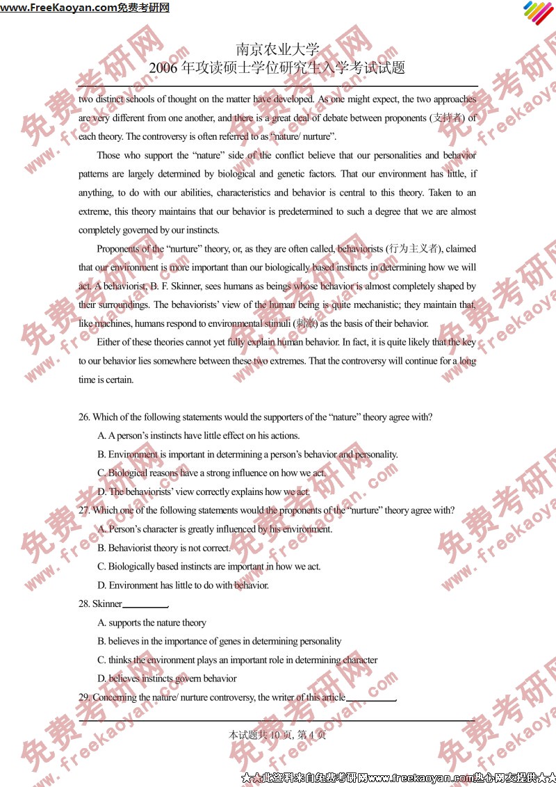 专业课考研经验 本站小编 FreeKaoyan 2018-01-23南京农业大学2006年考研真题-土壤学