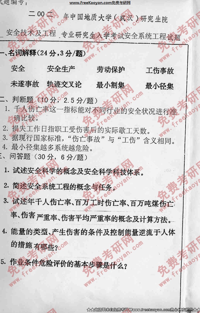 中国地质大学(武汉)2002年考研真题-安全系统工程