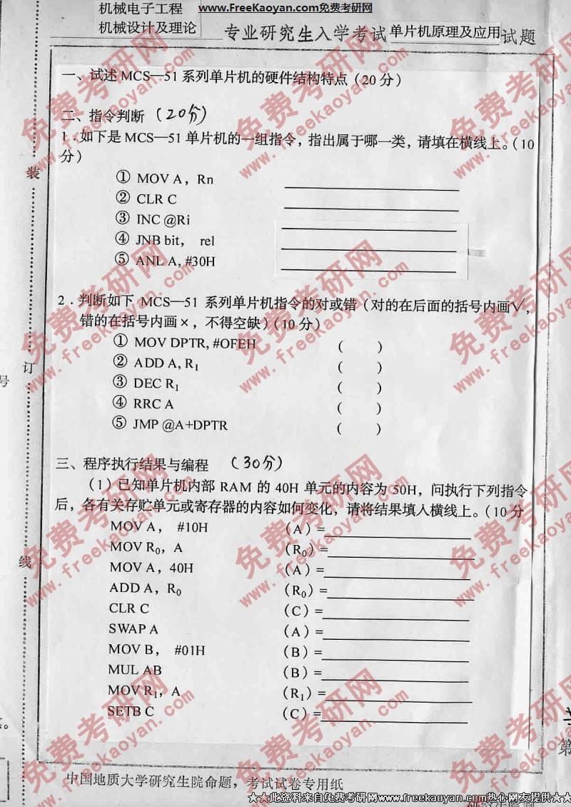 中国地质大学(武汉)2002年考研真题-单片机原理