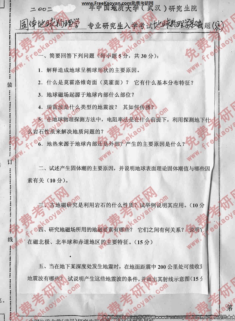专业课考研经验 本站小编 FreeKaoyan 2018-01-23中国地质大学(武汉)2002年考研真题-地球物理学概论