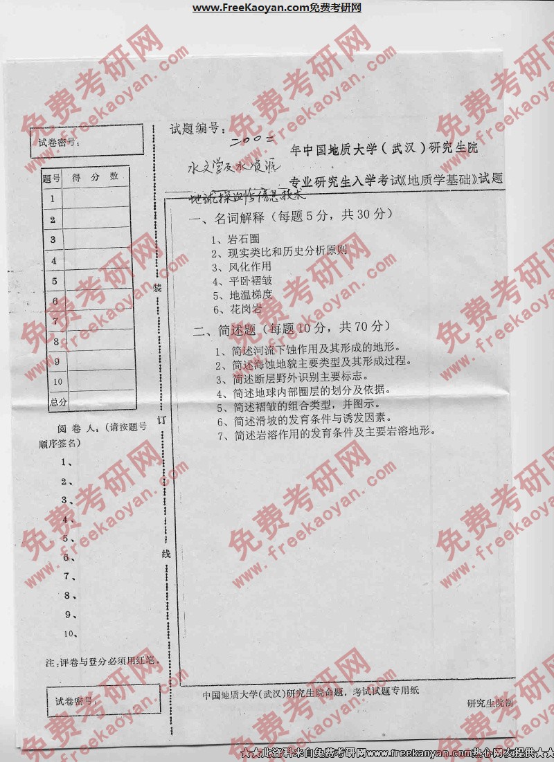 专业课考研经验 本站小编 FreeKaoyan 2018-01-23中国地质大学(武汉)2002年考研真题-地貌学与第四纪地质学