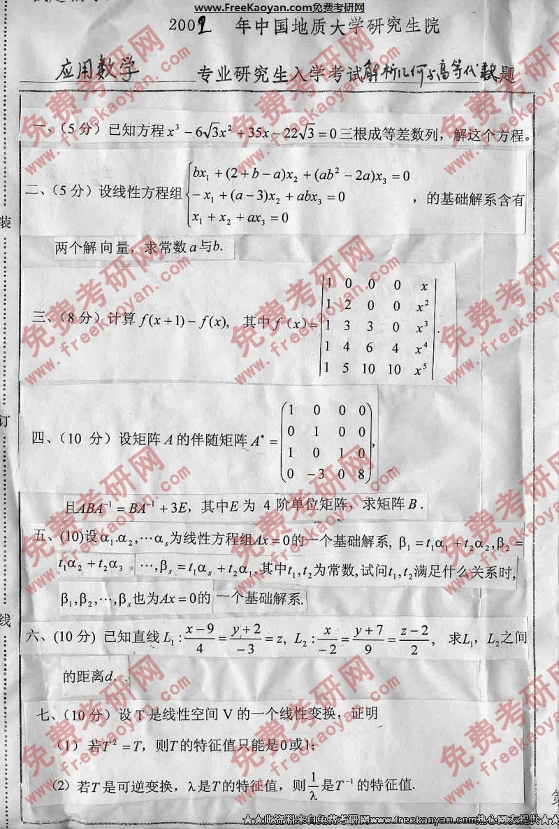 中国地质大学(武汉)2002年考研真题-解析几何与高等代数