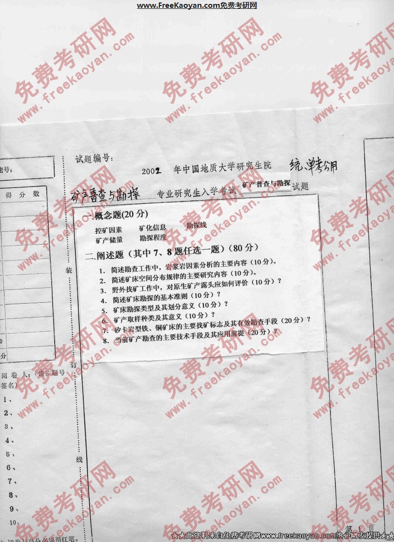 中国地质大学(武汉)2002年考研真题-矿产普查与勘探