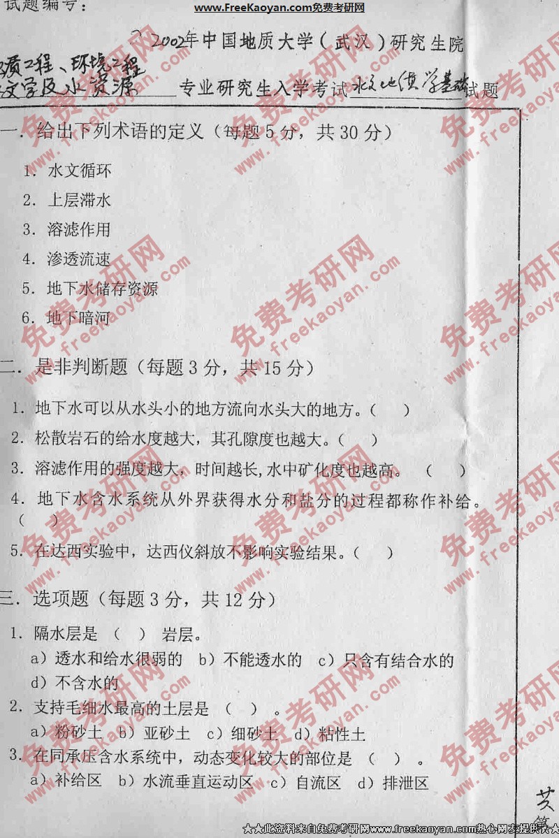 中国地质大学(武汉)2002年考研真题-水文地质学