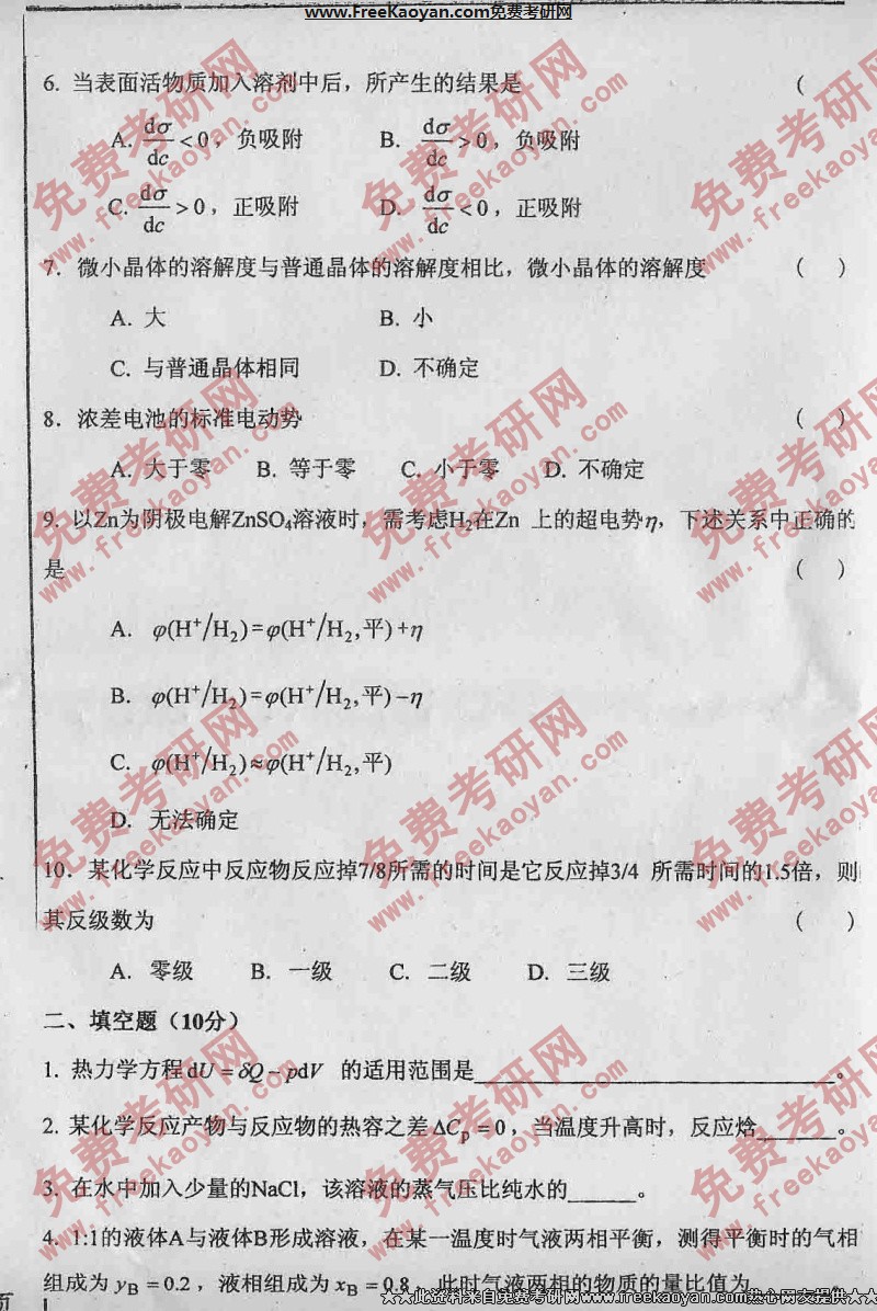 中国地质大学(武汉)2002年考研真题-物理化学(2)