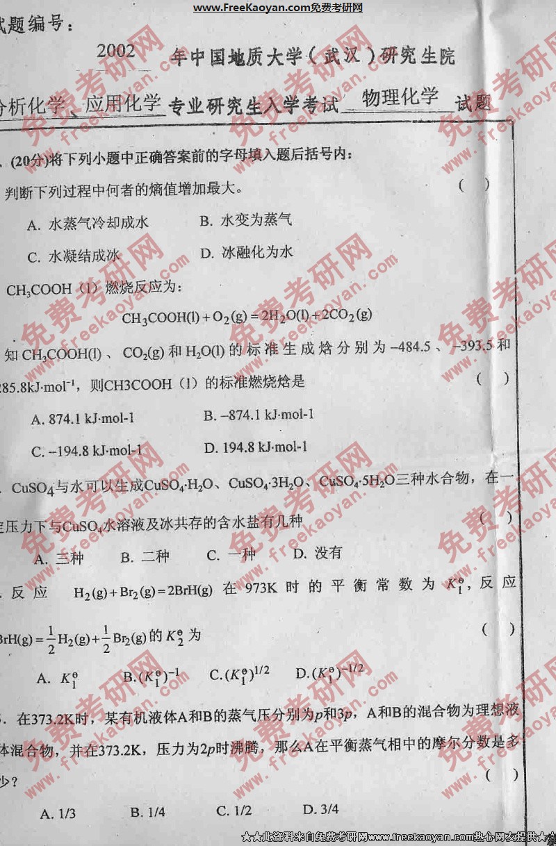 中国地质大学(武汉)2002年考研真题-物理化学(3)