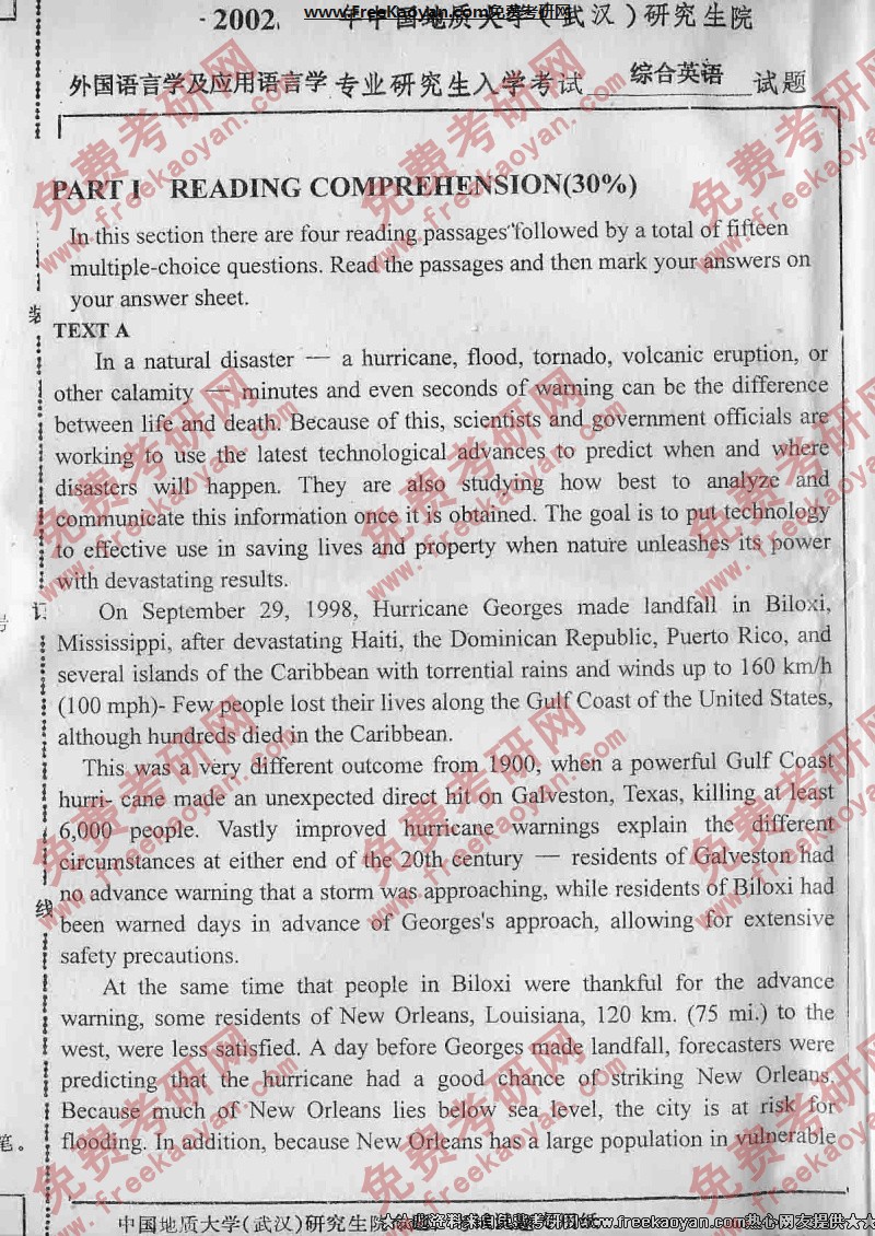 中国地质大学(武汉)2002年考研真题-英语综合考