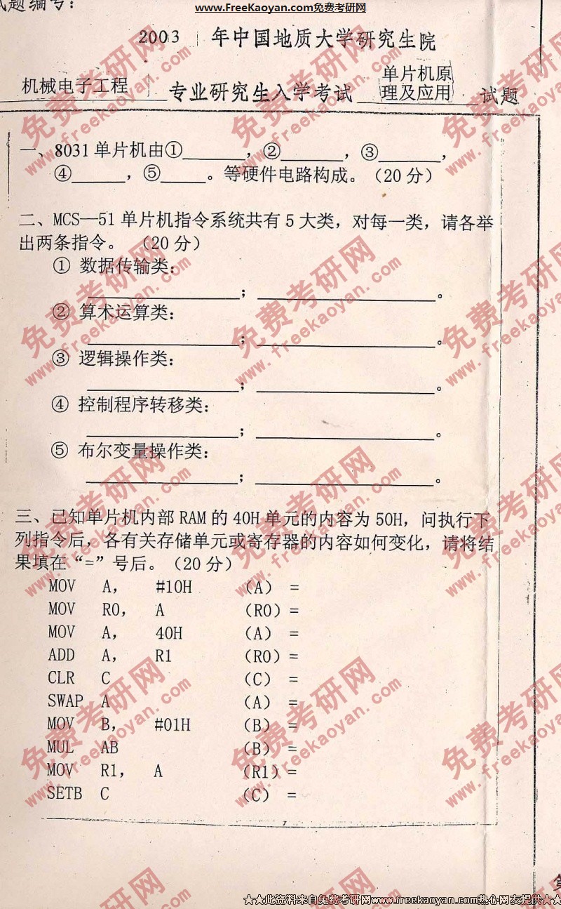 中国地质大学(武汉)2003年考研真题-单片机原理及应用