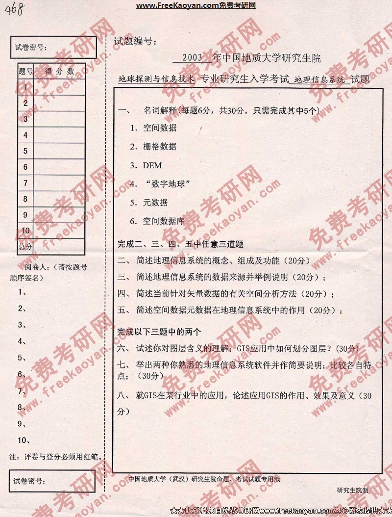 中国地质大学(武汉)2003年考研真题-地理信息系统