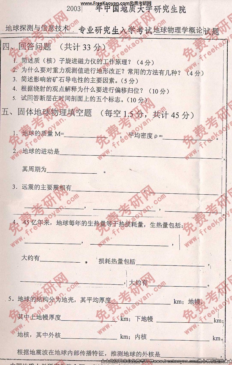 中国地质大学(武汉)2003年考研真题-地球物理学概论(3)