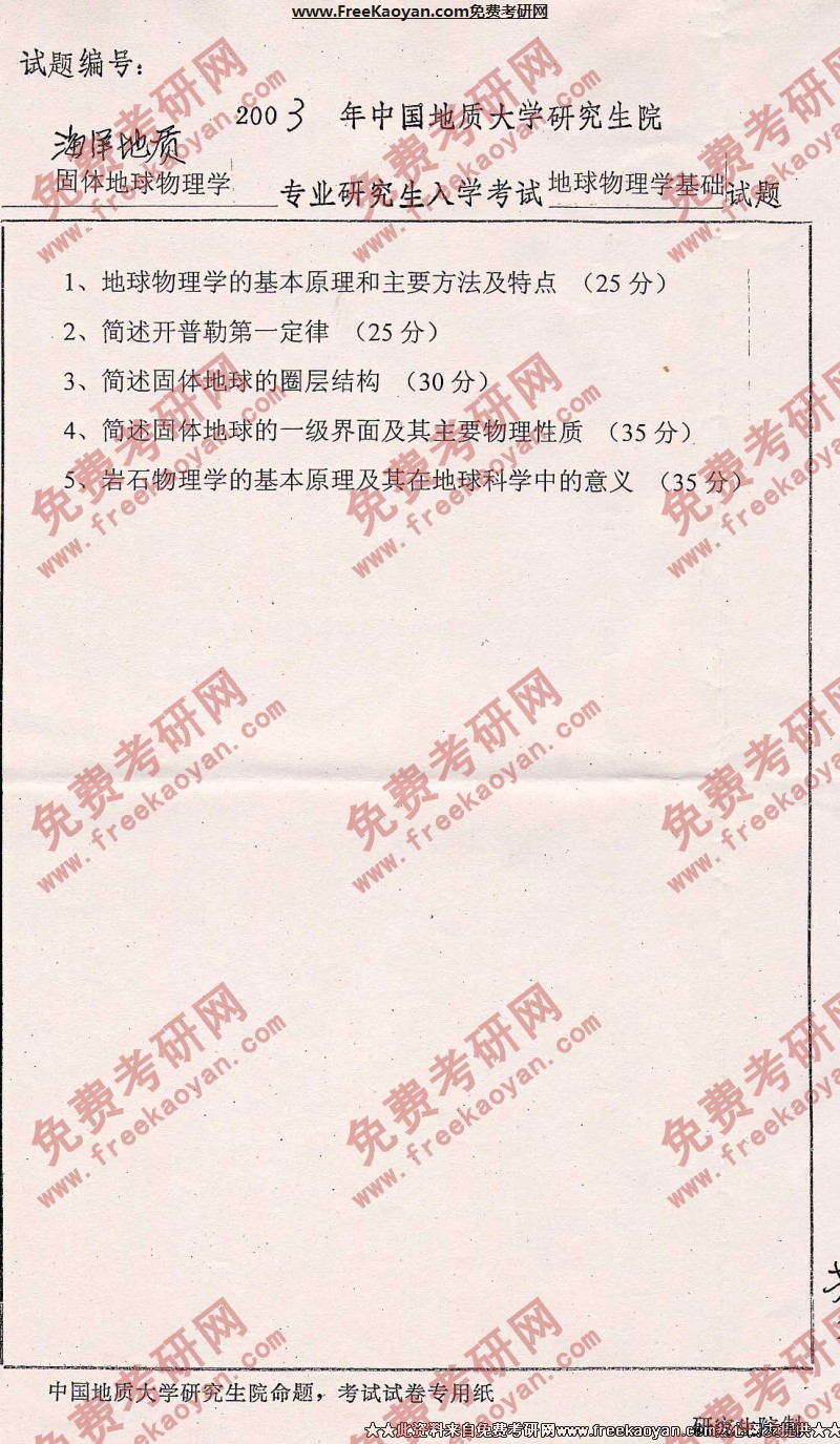 中国地质大学(武汉)2003年考研真题-地球物理学基础
