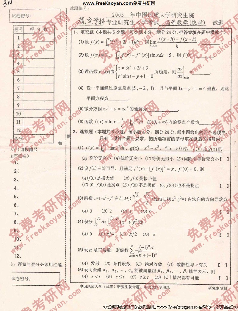 专业课考研经验 本站小编 FreeKaoyan 2018-01-23中国地质大学(武汉)2003年考研真题-地球化学