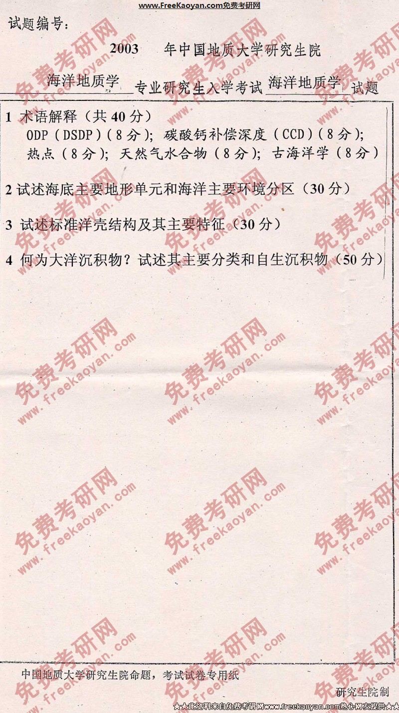 专业课考研经验 本站小编 FreeKaoyan 2018-01-23中国地质大学(武汉)2003年考研真题-古生物地史学