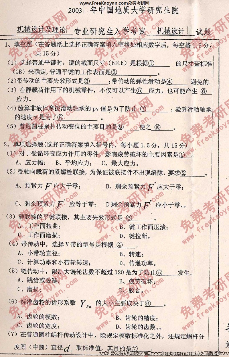 专业课考研经验 本站小编 FreeKaoyan 2018-01-23中国地质大学(武汉)2003年考研真题-工程力学
