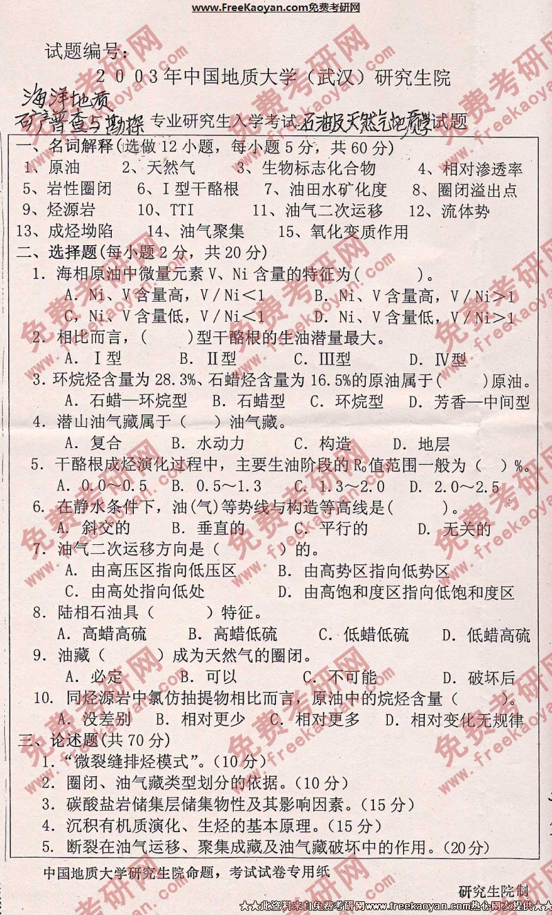 中国地质大学(武汉)2003年考研真题-石油及天然气地质学