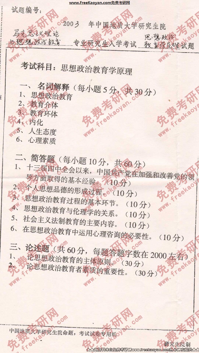 相关话题/考研真题 中国地质大学 教育学原理 思想政治