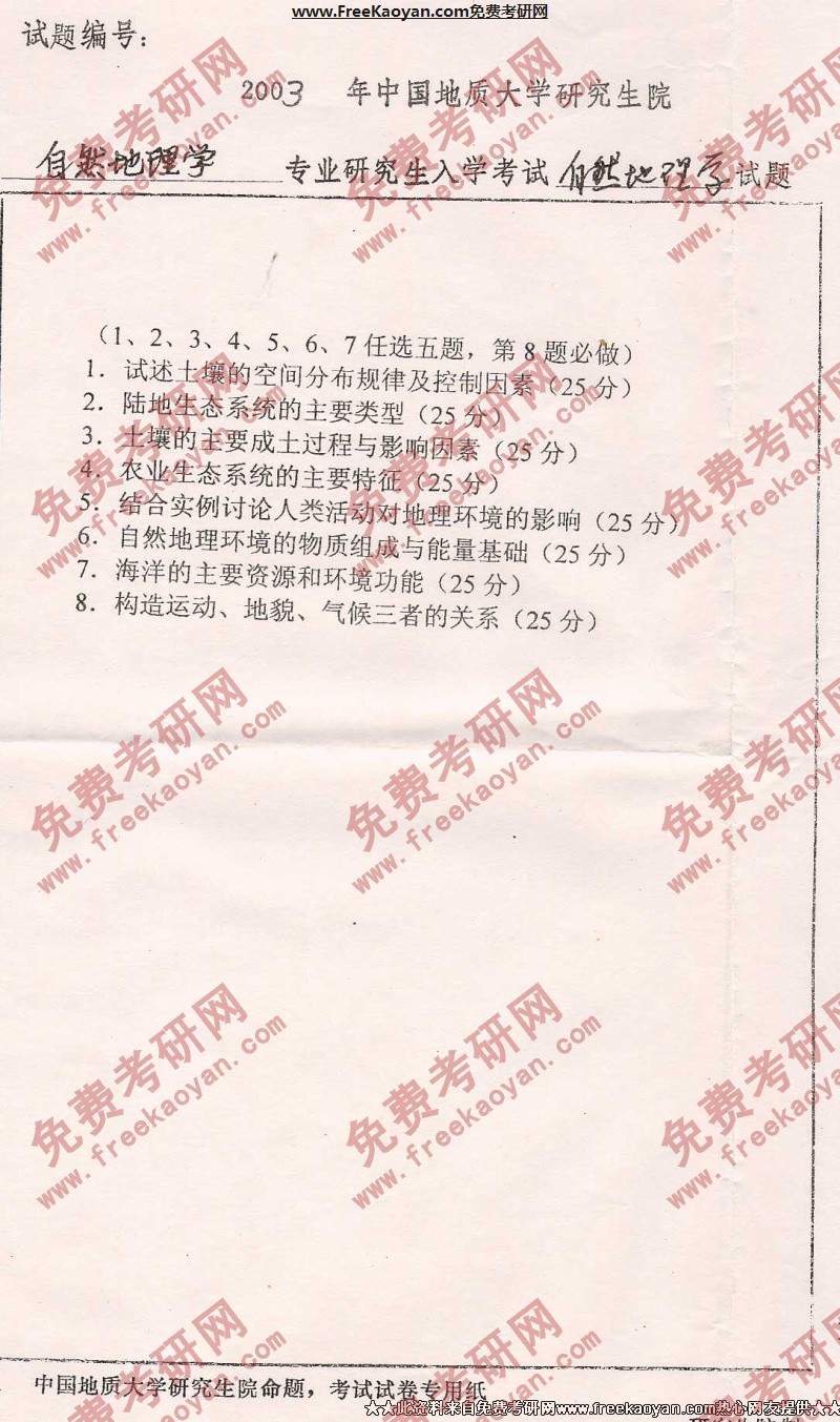 中国地质大学(武汉)2003年考研真题-自然地理学