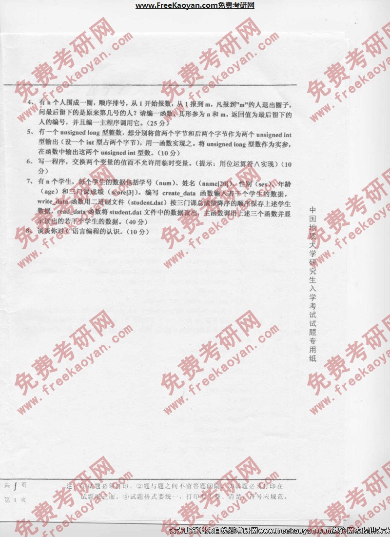 中国地质大学(武汉)2004年考研真题-C语言