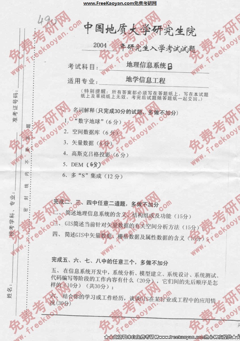 专业课考研经验 本站小编 FreeKaoyan 2018-01-23中国地质大学(武汉)2004年考研真题-地理信息系统A