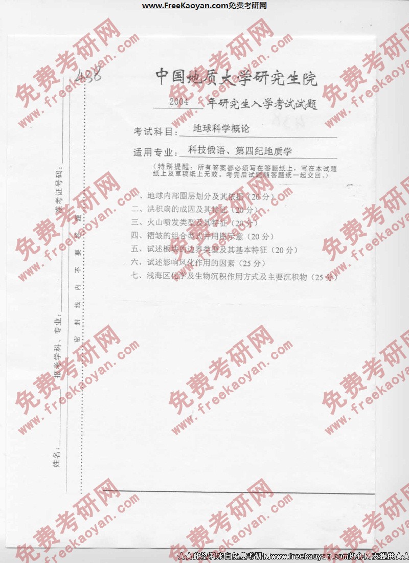 中国地质大学(武汉)2004年考研真题-地球科学概论