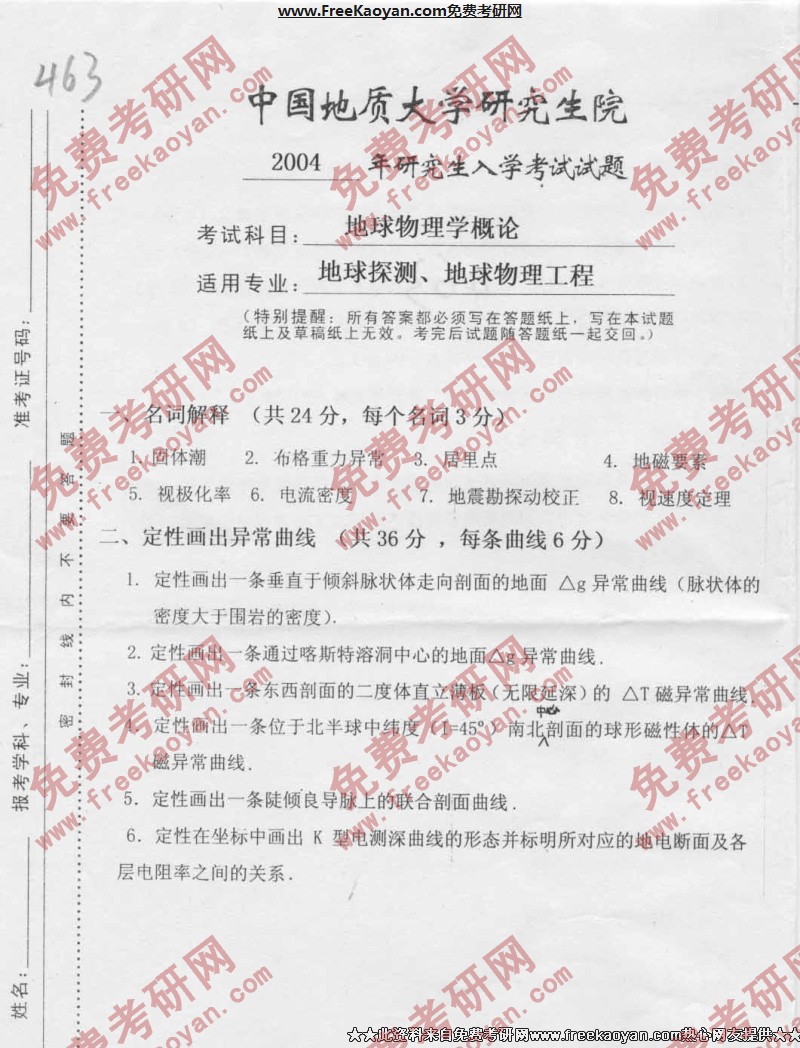 中国地质大学(武汉)2004年考研真题-地球物理学概论