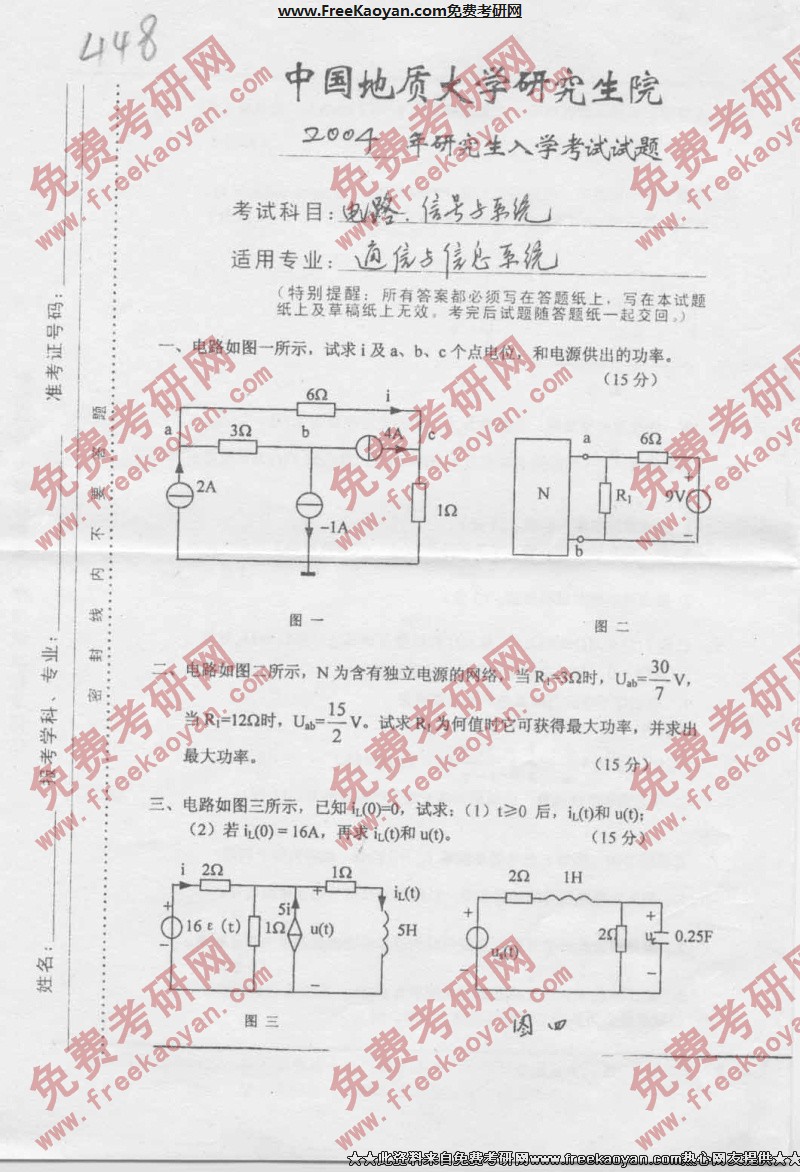 中国地质大学(武汉)2004年考研真题-电路、信号与系统