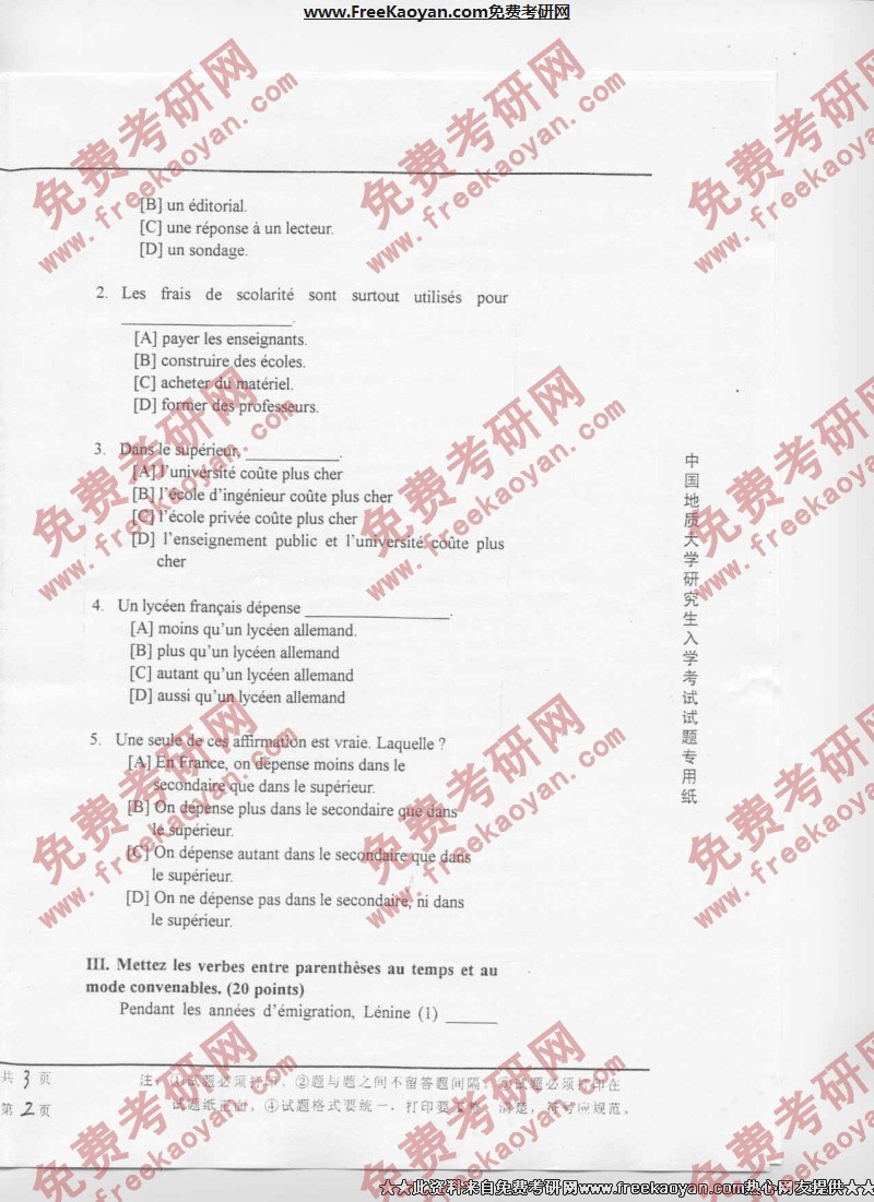 中国地质大学(武汉)2004年考研真题-法语(3)
