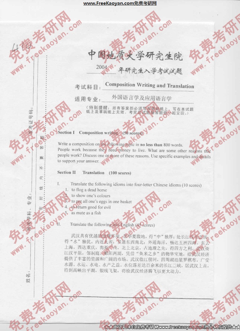 中国地质大学(武汉)2004年考研真题-翻译与写作