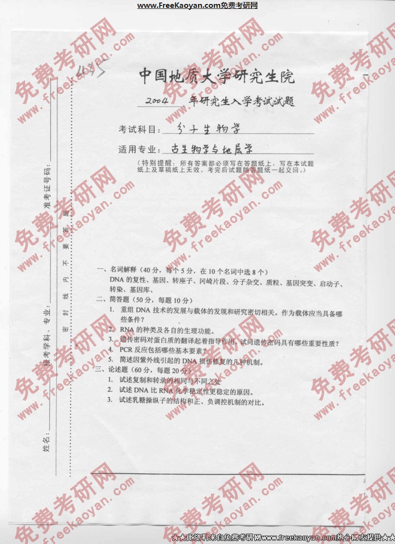 中国地质大学(武汉)2004年考研真题-分子生物学