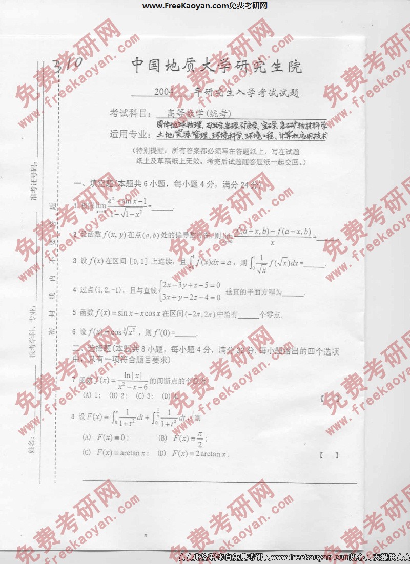 专业课考研经验 本站小编 FreeKaoyan 2018-01-23中国地质大学(武汉)2004年考研真题-地球化学