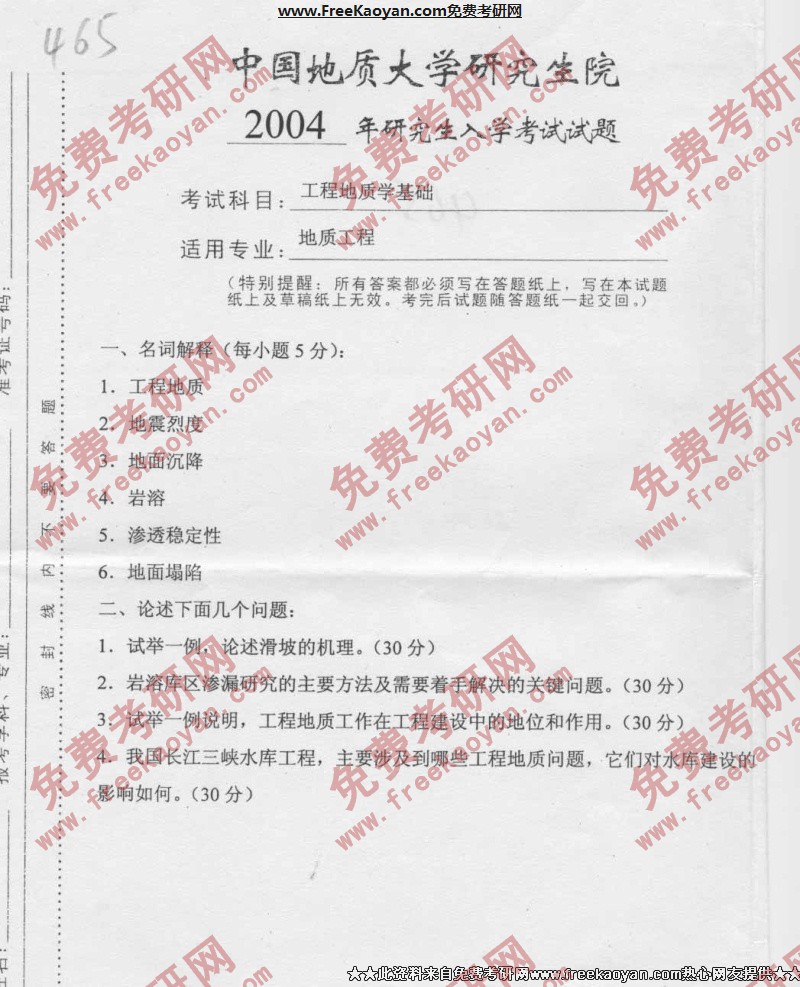 中国地质大学(武汉)2004年考研真题-工程地质学