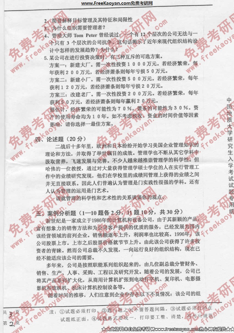 专业课考研经验 本站小编 FreeKaoyan 2018-01-23中国地质大学(武汉)2004年考研真题-管理学
