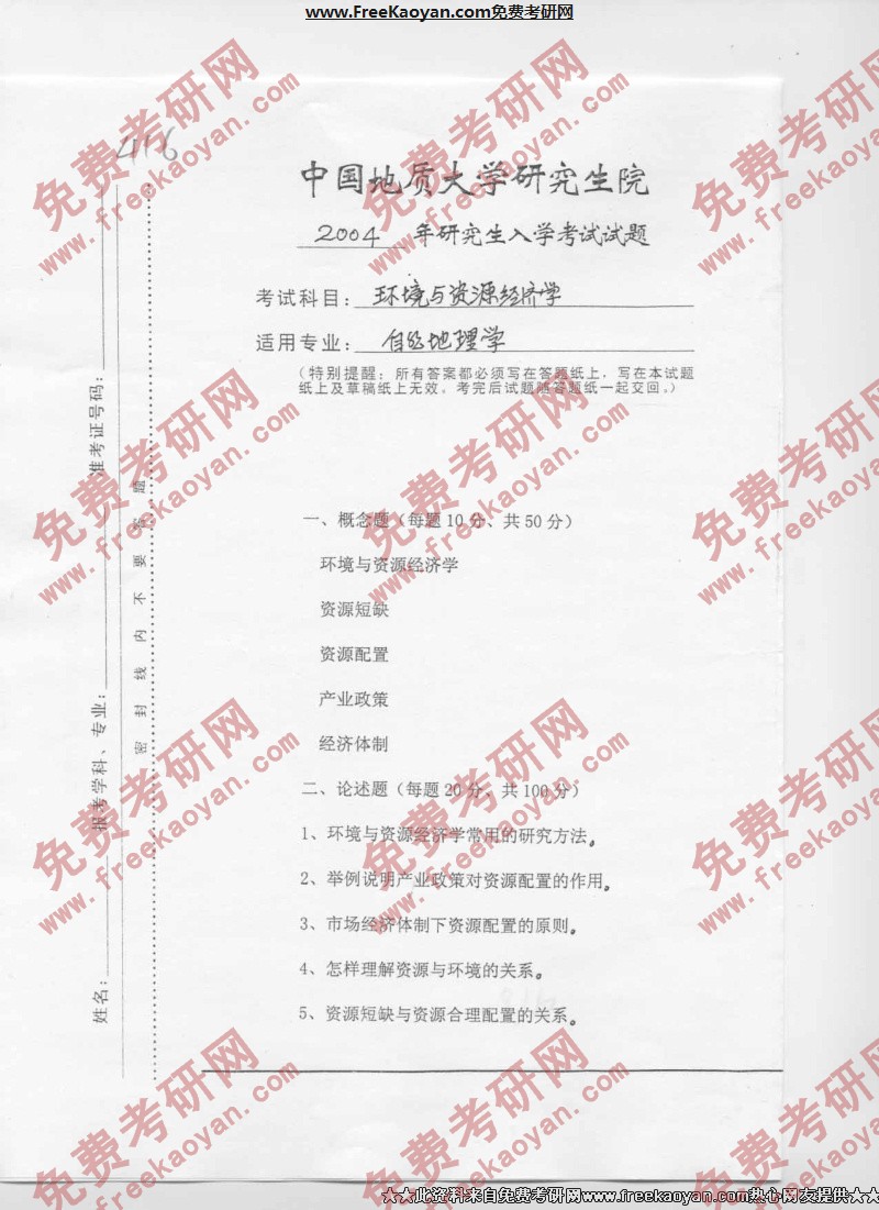中国地质大学(武汉)2004年考研真题-环境与资源经济学