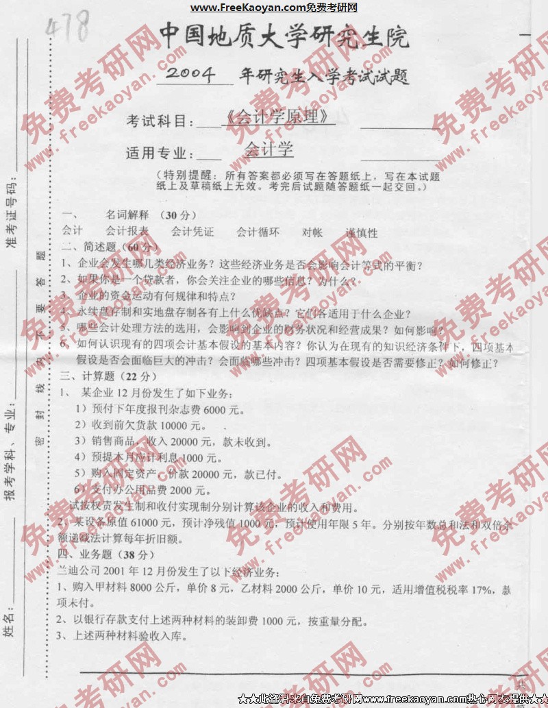 中国地质大学(武汉)2004年考研真题-会计学原理