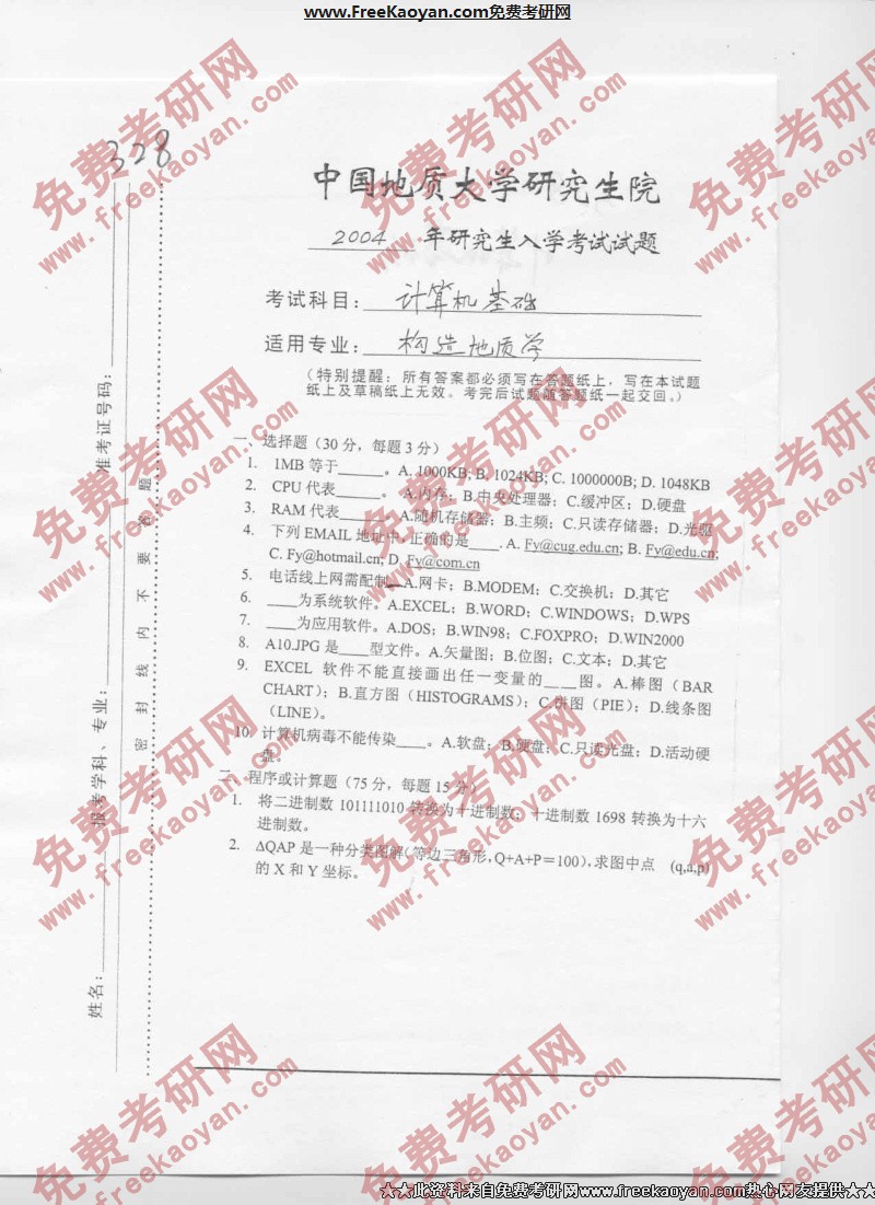 中国地质大学(武汉)2004年考研真题-计算机基础