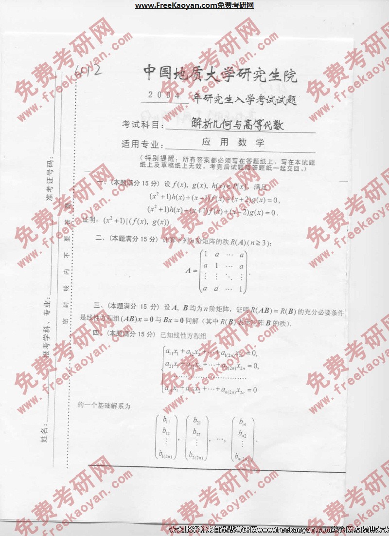 中国地质大学(武汉)2004年考研真题-解析几何与高等代数